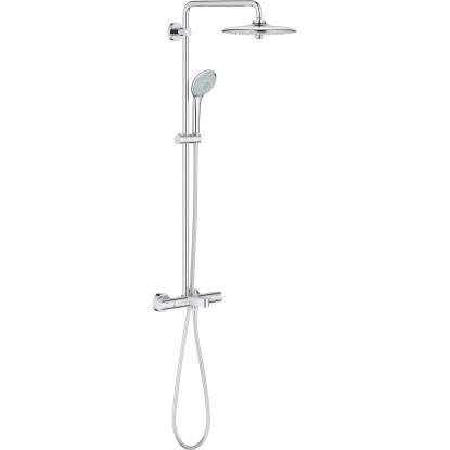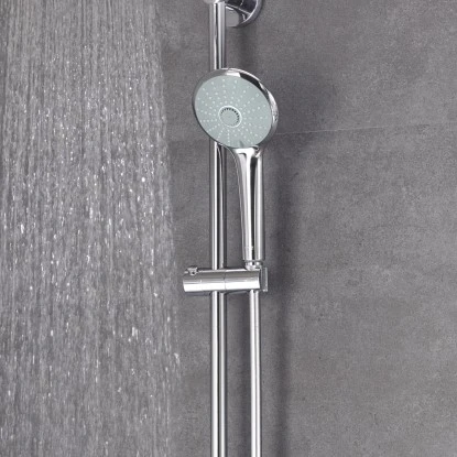 Das Grohe Duschsystem Euphoria System 260 mit Wannenthermostat garantiert ausgezeichnete Leistungsfähigkeit in Verbindung mit edlem Designer-Stil. Die DreamSpray-Technologie stellt einen gleichmäßigen Wasserfluss aus jeder Düse sicher. Die 26 cm große Kopfbrause besitzt drei unterschiedliche Strahlzonen. Der Jet Strahl ist kraftvoll und konzentriert, optimal für das Ausspülen von Shampoo und eine belebende Kopf- oder Nackenmassage. Der SmartRain Strahl ist breiter für ein belebendes, entspannendes Erlebnis und der Rain Strahl nutzt alle Düsen des großen Brausebodens, damit der ganze Körper komplett mit Wasser bedeckt ist und das Duschen wirklich angenehm ist. Um den gewünschten Strahl auszuwählen, muss der ergonomische Drehknopf auf der Spülbrause gedreht werden. Der 45 cm große Duscharm ist um 180° schwenkbar für mehr Flexibilität. Die 11 cm große Handbrause bietet drei Strahloptionen: den weichen Rain Strahl, den umweltfreundlichen SmartRain und den kraftvollen Massage Jet Strahl.