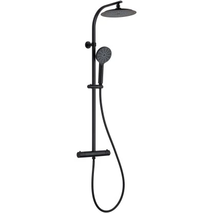 Das elegante schütte Duschsystem Madura Fresh mit Thermostatarmatur besteht aus hochwertiger Edelstahl-Duschsäule in der trendstarken Optik Schwarz Matt und Kunststoff-Brauseschlauch mit Standard 1/2 Zoll Anschluss. Die großformatige, sehr flache Edelstahl-Kopfbrause und moderne Handbrause mit drei Strahlvarianten(Spray, Massage, Kombistrahl) sorgen für pures Duschvergnügen. Die vorhandene Thermostatarmatur sorgt für einen gleichmäßigen Temperaturfluss und die Sicherheitssperre bei 38°C minimiert das Risiko vor Verbrühungen. Gewechselt wird bequem mit dem integrierten Umsteller. Die Antikalk-Noppen an den Brauseköpfen sorgen für die einfache Entfernung von Kalkrückständenund machen das Reinigen zum Kinderspiel. Dank separater Wasserspardichtung ist bis zu 50% Wasserersparnis möglich. Variable Wandhalterung kann für vorhandener Bohrlöcher genutzt werden.