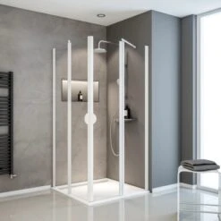 Der Schulte-Eckeinstieg der Serie Sunny in der Farbe Alpinweiß mit klarem Echtglas in einer Größe von 180 cm x 90 cm x 90 cm beeindruckt mit insgesamt vier großzügig geschnittenen Echtglasscheiben (ESG). Diese sind äußerst widerstandsstark, die beiden großflächigen Drehtüren sind mit dominanten Aluminiumprofilen an den feststehenden Seitenteilen befestigt, was sowohl eine hohe Stabilität als auch einen komfortablen Einstieg gewährleistet.