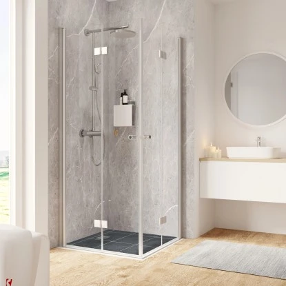 Die Schulte ExpressPlus Drehfalttür ist eine Eckeinstieg-Duschtür, die auf Fliesen montiert werden kann. Sie hat eine Größe von 200 cm x 90 cm x 90 cm und besteht aus vier Sicherheitsglas-Elementen (ESG) mit einer Dicke von 6 mm. Die beiden Tür-Elemente öffnen sich über zwei stilvolle Griffe an der Ecke und bieten einen großzügigen Einstiegsbereich. Die platzsparende Tür lässt sich auch einfach zusammenfalten, sodass kein Element in den Raum hineinragt, wenn sie geöffnet ist. Dies macht die Drehfalttür zur optimalen Tür-Lösung für kleine Badezimmer. Die eleganten Profile und Anbauteile setzen die Duschtür auch schön in Szene und halten sie sicher an ihrem Platz.