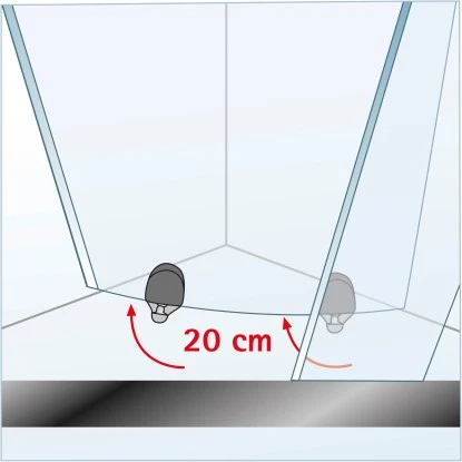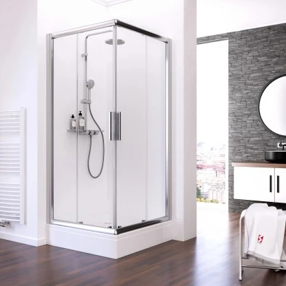 Die beiden Schiebetüren erzeugen einen großzügigen Eckeinstieg in den Duschbereich, verhalten sich aber ebenso platzsparend. Die zur Seite öffnenden Duschtüren ragen zu keinem Zeitpunkt in den Raum hinein.
