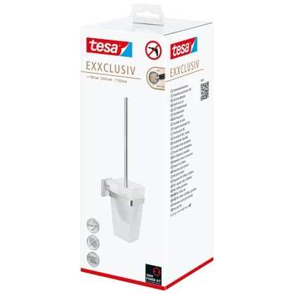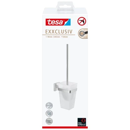 Mit dem modernen Design in Edelstahloptik sind die Tesa Bad-Artikel der Serie Exxclusiv ein Hingucker in jedem Bad oder Gäste-WC. Noch dazu sind die praktischen Bad-Artikel rostfrei. Mit der Tesa WC-Bürstengarnitur Exxclusiv können Sie Ihre WC-Bürste einfach an der Wand aufbewahren, wo sie nicht beim Wischen und Saubermachen stört. Der Behälter aus Milchglas lässt sich für die einfache Reinigung herausnehmen. Zudem verfügt die im Lieferumfang enthaltene WC-Bürste über einen auswechselbaren Bürstenkopf.