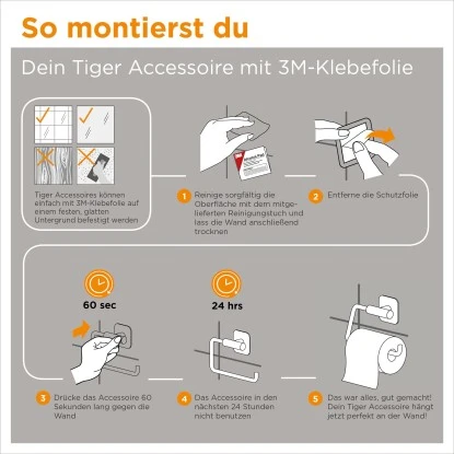 Der Tiger Tune Toilettenpapierhalter mit Deckel verfügt über eine Oberfläche aus gebürstetem Messing mit mattschwarzen Akzenten. Der schwenkbare Toilettenrollenhalter ist mit einer strapazierfähigen 3M-Klebefolie für eine einfache Montage ohne Bohren auf allen glatten, stabilen Untergründen ausgestattet. Sollte die Oberfläche für die Verwendung der selbstklebenden Rückseite ungeeignet sein, kann der WC-Rollenhalter optional mit Schrauben und Dübeln an der Wand montiert werden. Die Serie Tune umfasst eine breite Auswahl weiterer Accessoires für Badezimmer und Toilette, die alle wunderbar zusammenpassen. Durch das klassische Design und die trendigen Oberflächen können die Tiger Tune Accessoires einfach mit jedem Einrichtungsstil kombiniert werden. Die freistehenden und selbstklebenden Accessoires verleihen dem Badezimmer und der Toilette einen ganz besonderen Look.