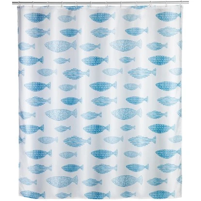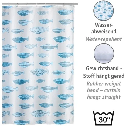 Mit dem Wenko Anti-Schimmel Duschvorhang in Aquamarin sind die Zeiten von angeschimmelten Duschvorhängen vorbei. Zusätzlich ist der schöne und effektive Helfer auch anti-bakteriell beschichtet. Wenko bringt mit diesem Novum Hygiene und Design ins Badezimmer. Natürlich ist dieser Duschvorhang EU-patentiert. Auch in Sachen Optik muss sich der attraktive Vorhang nicht verstecken. Das ausgefallene Fisch-Design in wunderschönem Aquamarin auf weißem Hintergrund verleiht Ihrem Bad eine entspannte Atmosphäre. Mit einer Breite von 180 cm eignet sich der ausgefallene Duschvorhang sowohl für Dusche als auch Badewanne. Der hochwertig verarbeitete Duschvorhang ist aus besonders haltbarem Polyester hergestellt. Durch die Oberflächen-Veredelung ist das Material wasserabweisend. Er ist pflegeleicht und bei 30 °C waschbar. Der obere Saum ist mit einer verstärkten Lochleiste und rostfreien Metallösen versehen. Am unteren Ende ist ein umweltfreundliches Gewichtsband aus Gummi (statt Bleikette) formgebend. Im Lieferumfang sind 12 weiße Duschvorhangringe aus Kunststoff enthalten. Im Design des Duschvorhangs hat Wenko auch die korrespondierenden Accessoires! Der passende Zahnputzbecher & Seifenspender sowie die Seifenablage und WC-Garnitur Aquamarin bereichern das Flair zusätzlich.