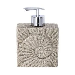 Die schöne Bad-Accessoires Serie Fossil verleiht jedem Badezimmer ein Stück Erdgeschichte. Mit ihrer strukturierten Oberfläche, die eines der bekanntesten Fossilien abbildet, auf hochwertigem Polyresin bringt die Bad-Serie ein ausgefallenes Ambiente in Bad und Gäste-WC. Der praktische, beige Seifenspender kann individuell mit Flüssigseife oder Waschlotion gefüllt werden. Durch leichten Druck auf den Dosierknopf wird die gewünschte Menge Seife oder Lotion herausgepumpt.