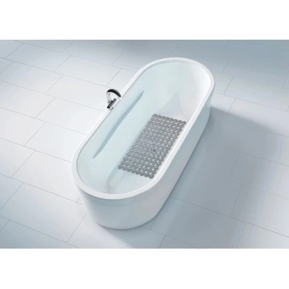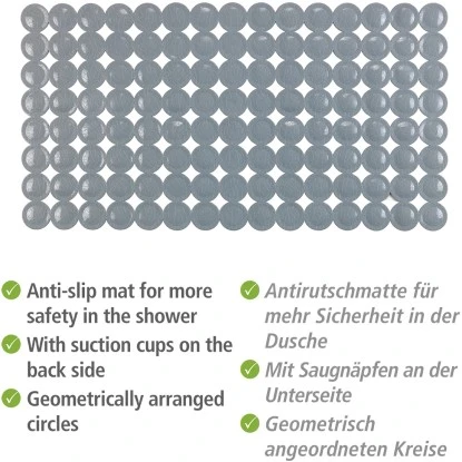 Für mehr Sicherheit und Komfort in der Badewanne sorgt die praktische Wenko Wanneneinlage Belem 67,5 cm x 36 cm in Grau. Die rechteckige Wanneneinlage zeichnet eine Kombination aus ansprechender Optik und funktionaler Beschaffenheit aus, auf diese Weise verleiht sie Ihrer Wanne auf elegante Art den letzten Schliff. Das Design der Antirutschmatte überzeugt dank geometrisch angeordneten Kreisen, die ein in sich stimmiges Bild ergeben. In trendigem Grau gehalten, fügt sich die Einlage bestens in Ihr bestehendes Badezimmer-Interior ein. Die dekorative Matte in 67,5 cm x 36 cm verfügt über eine hautsympathische, angenehme Oberfläche mit Rutschstopp-Struktur, welche zuverlässig das Ausrutschen in der Badewanne verhindert und für einen sicheren Stand sorgt. Die Sicherheitseinlage aus hochwertig verarbeitetem Kunststoff eignet sich für gängige Badewannen. Die Oberfläche moderner Sanitärkeramik ist hart und glatt, in Verbindung mit Wasser und Seife kann sie sich daher schnell in eine gefährliche Rutschbahn verwandeln. Dem wirkt die schicke Anti-Rutschmatte entgegen: Die Saugnäpfe an der Unterseite bieten Haftung und verhindern das Verrutschen. Wichtig hierbei ist, dass der Untergrund eben, sauber und fettfrei ist. Für einen sicheren Einsatz, die Saugnäpfe vor Gebrauch fest andrücken.