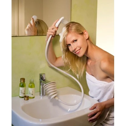 Die praktische Waschbecken-Dusche eignet sich ideal für zu Hause und unterwegs. Mit dem Universal-Adapter passt sie garantiert auf alle Wasserhähne.
